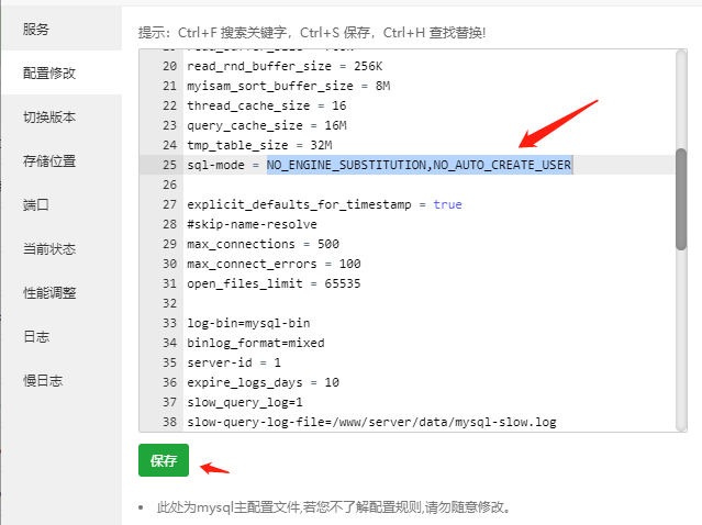 2.點擊配置修改,查找sql-mode或sql_mode (可使用Ctrl+F快捷查找)